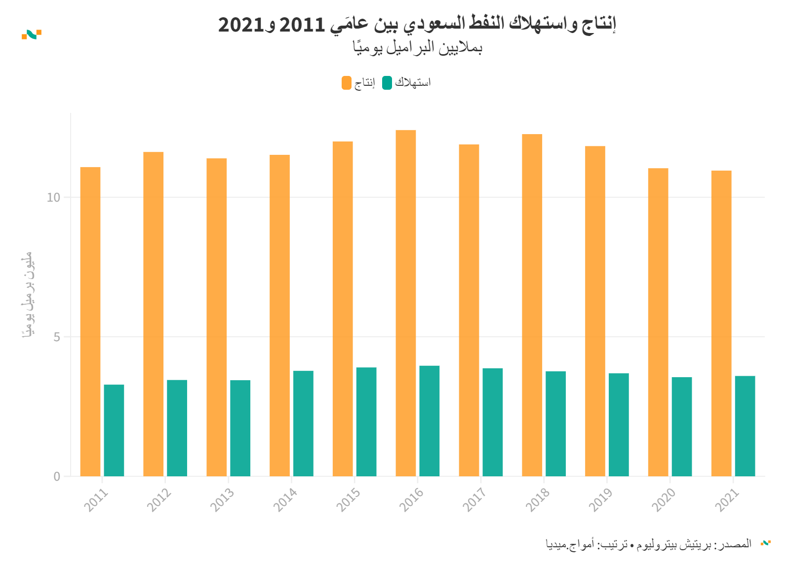 إنتاج واستهلاك النفط السعودي بين عامَي 2011 و2021