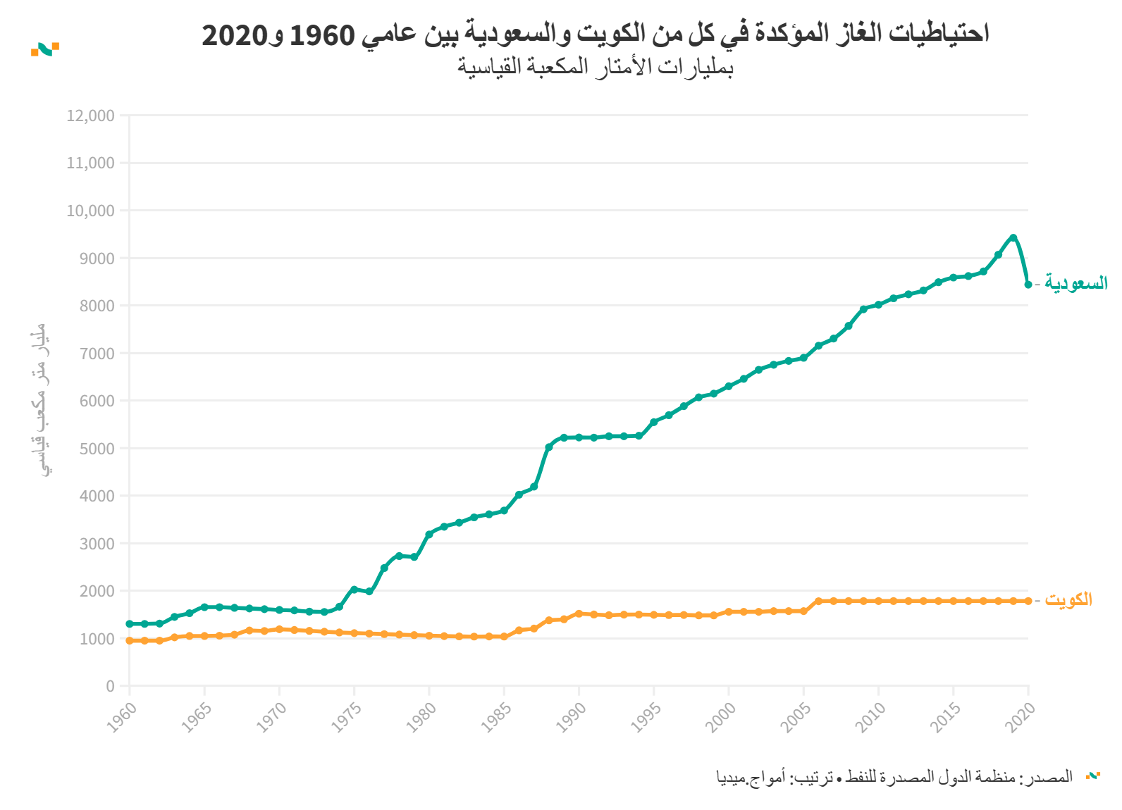 احتياطيات الغاز المؤكدة في كل من الكويت والسعودية بين عامي 1960 و2020