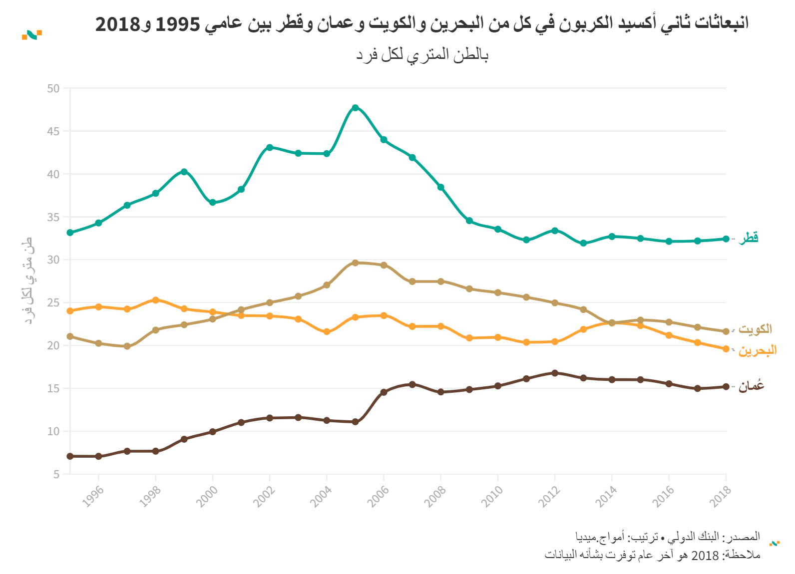 انبعاثات ثاني أكسيد الكربون في كل من البحرين والكويت وعمان وقطر بين عامي 1995 و2018