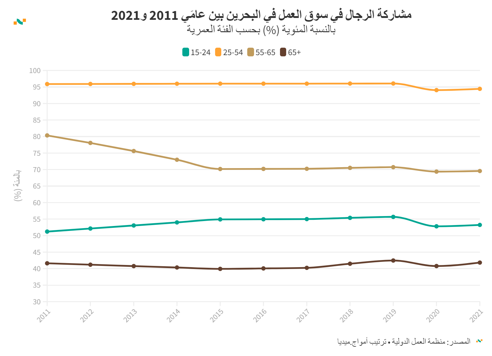 مشاركة الرجال في سوق العمل في البحرين بين عامَي 2011 و2021