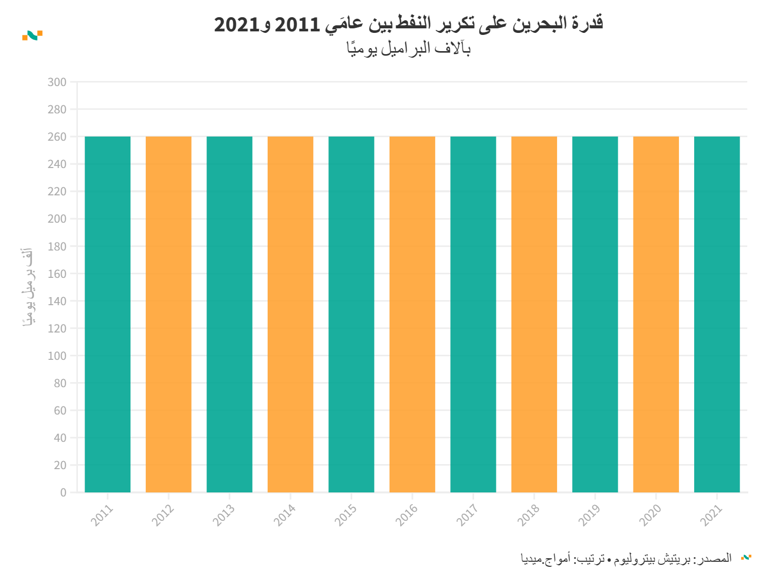 قدرة البحرين على تكرير النفط بين عامَي 2011 و2021