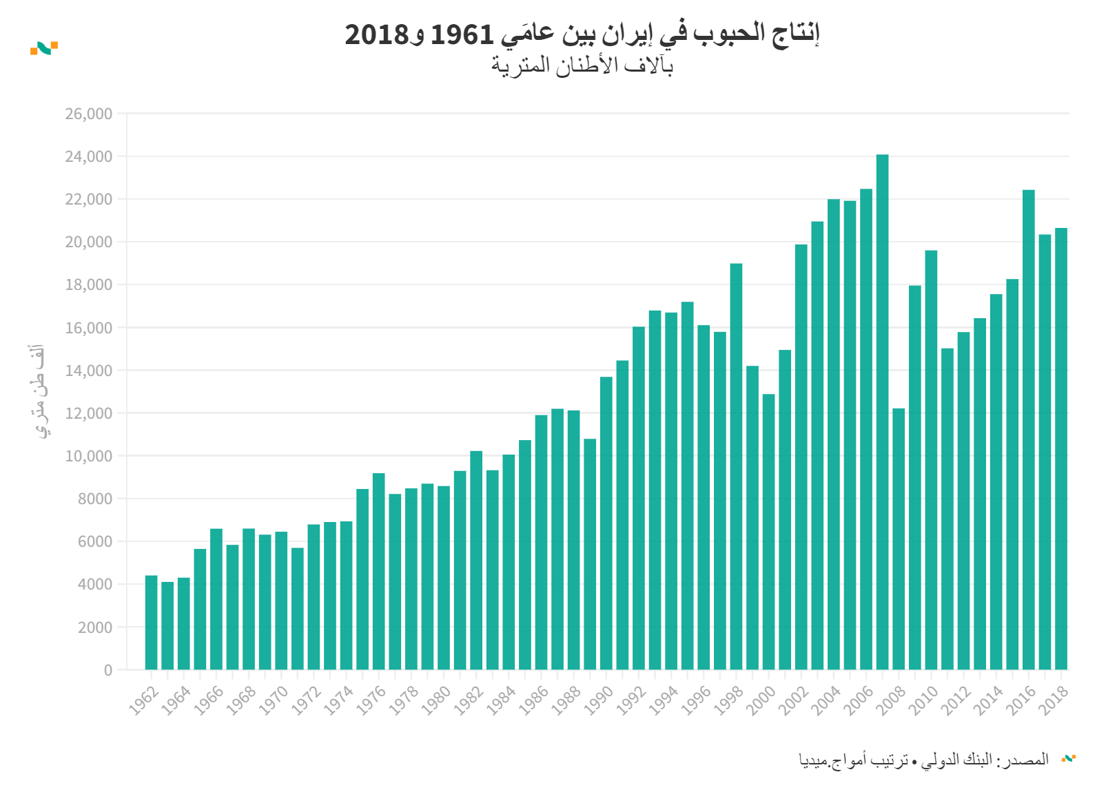 إنتاج الحبوب في إيران بين عامَي 1961 و2018