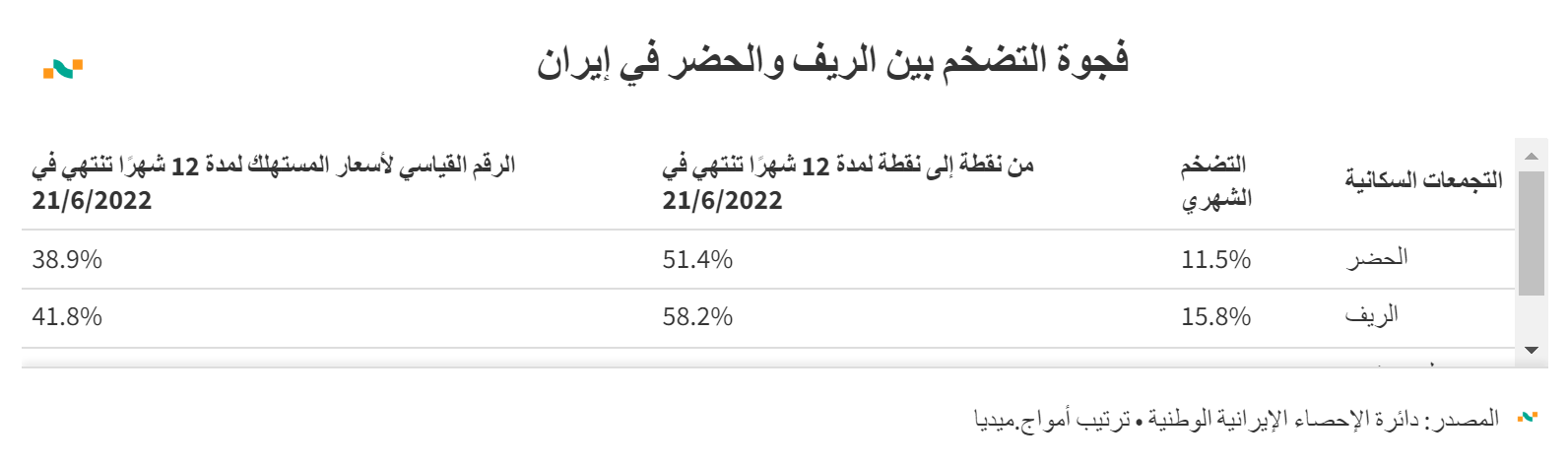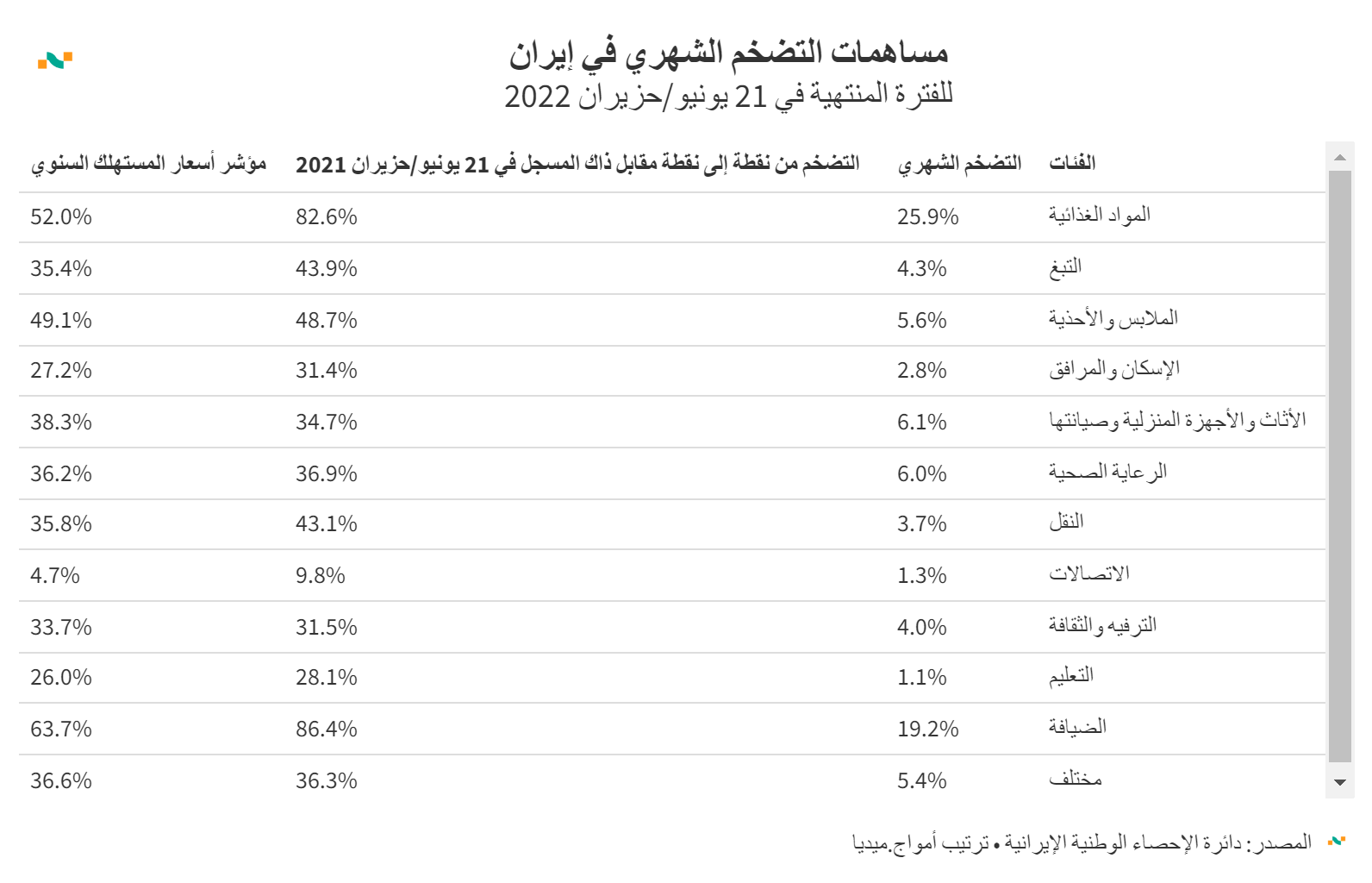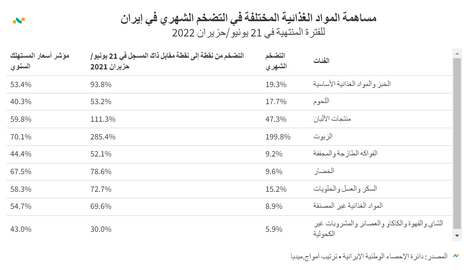 مساهمة المواد الغذائية المختلفة في التضخم الشهري في إيران