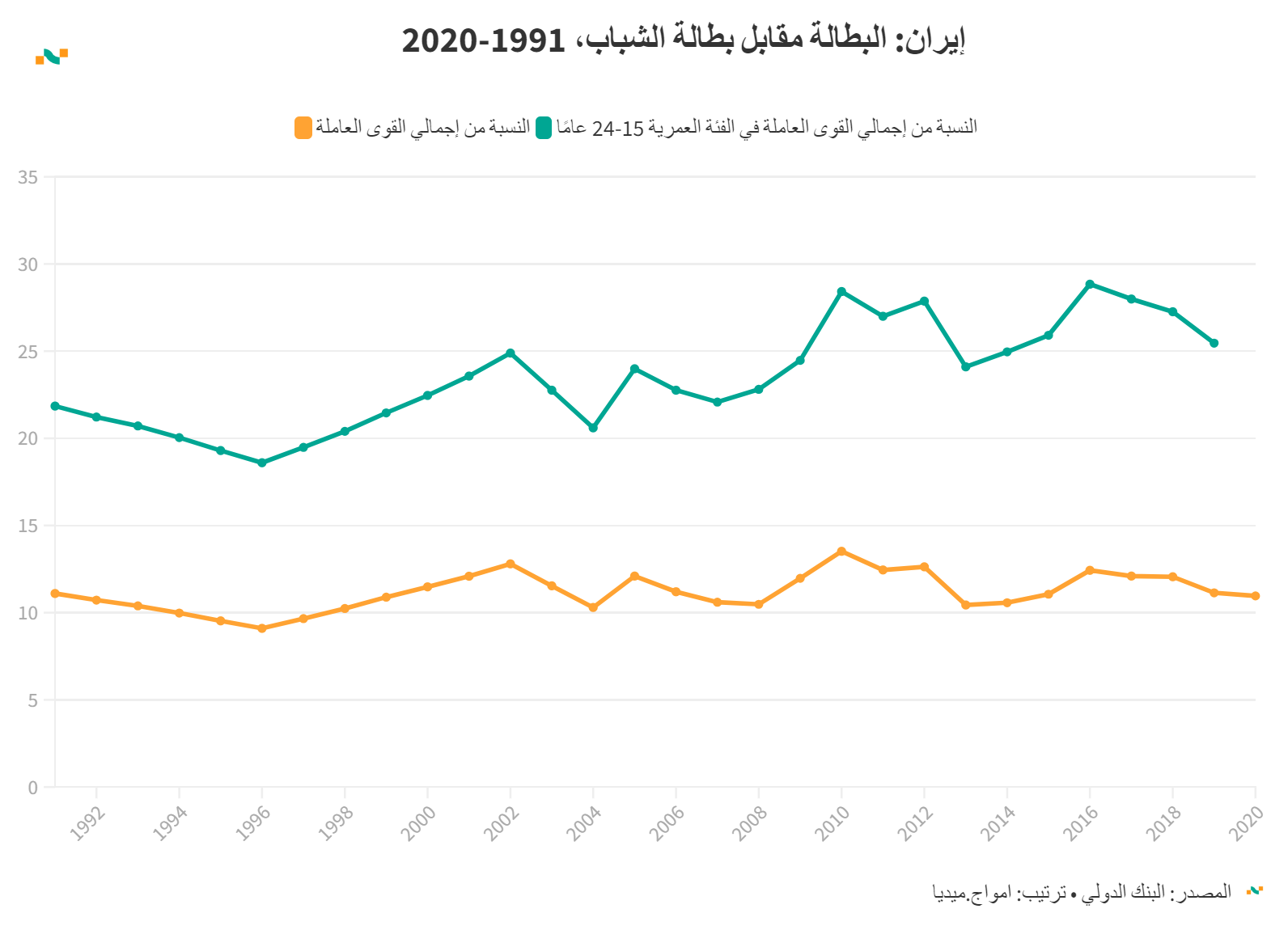 إيران: البطالة مقابل بطالة الشباب، 1991-2020