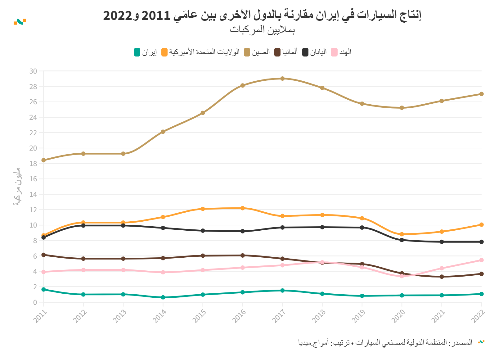 إنتاج السيارات في إيران مقارنة بالدول الأخرى بين عامَي 2011 و2022