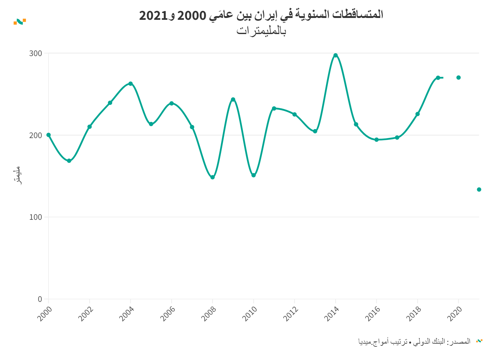 المتساقطات السنوية في إيران بين عامَي 2000 و2021
