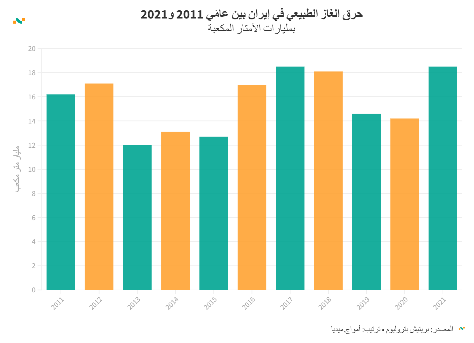 حرق الغاز الطبيعي في إيران بين عامَي 2011 و2021