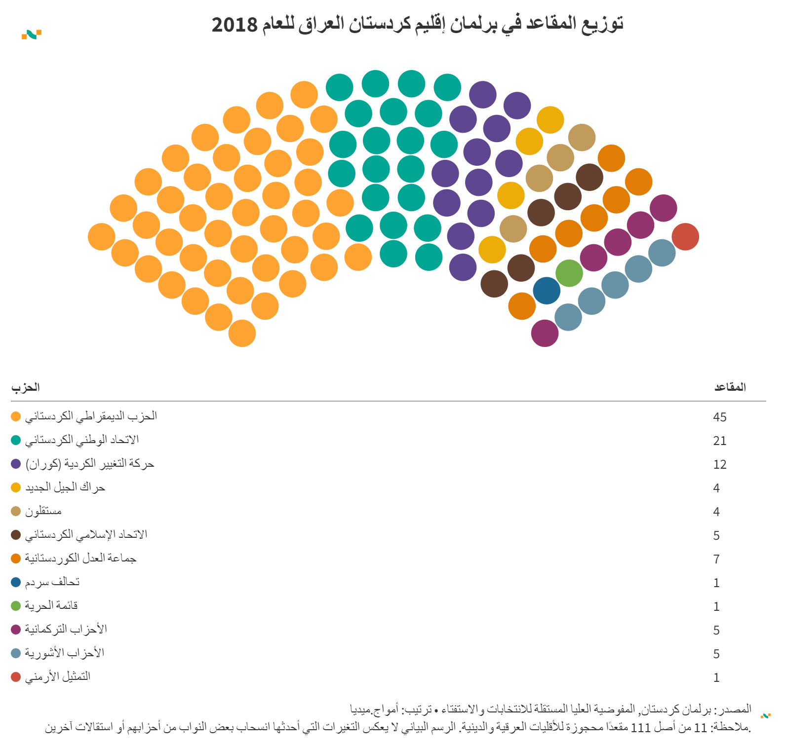 توزيع المقاعد في برلمان إقليم كردستان العراق للعام  2018