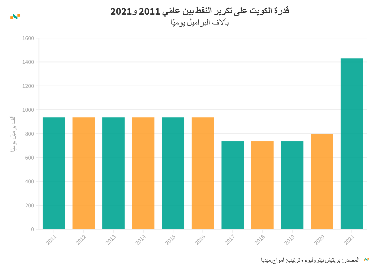 قدرة الكويت على تكرير النفط بين عامَي 2011 و2021