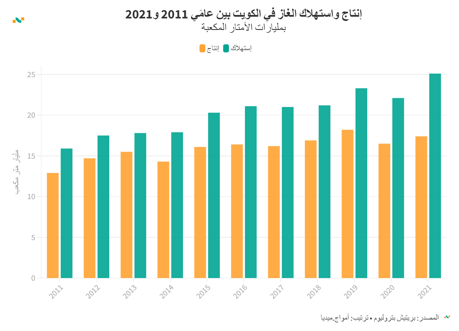 إنتاج واستهلاك الغاز في الكويت بين عامَي 2011 و2021