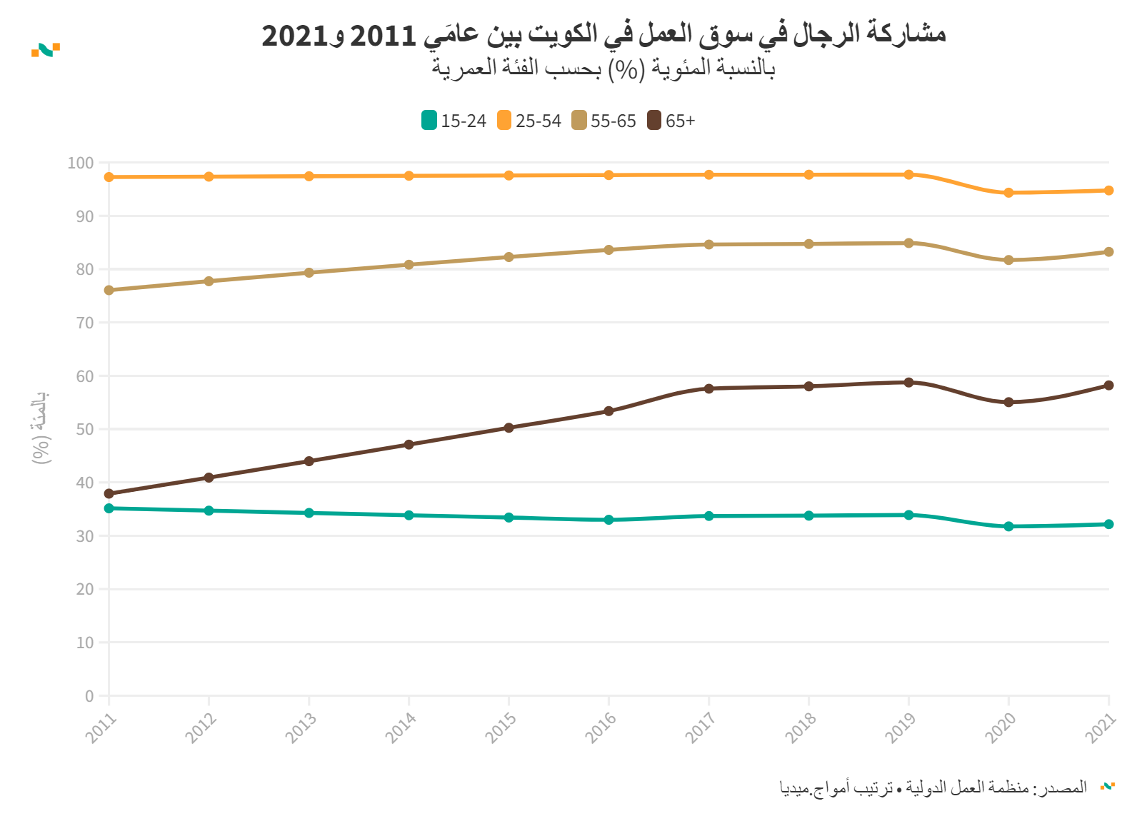 مشاركة الرجال في سوق العمل في الكويت بين عامَي 2011 و2021