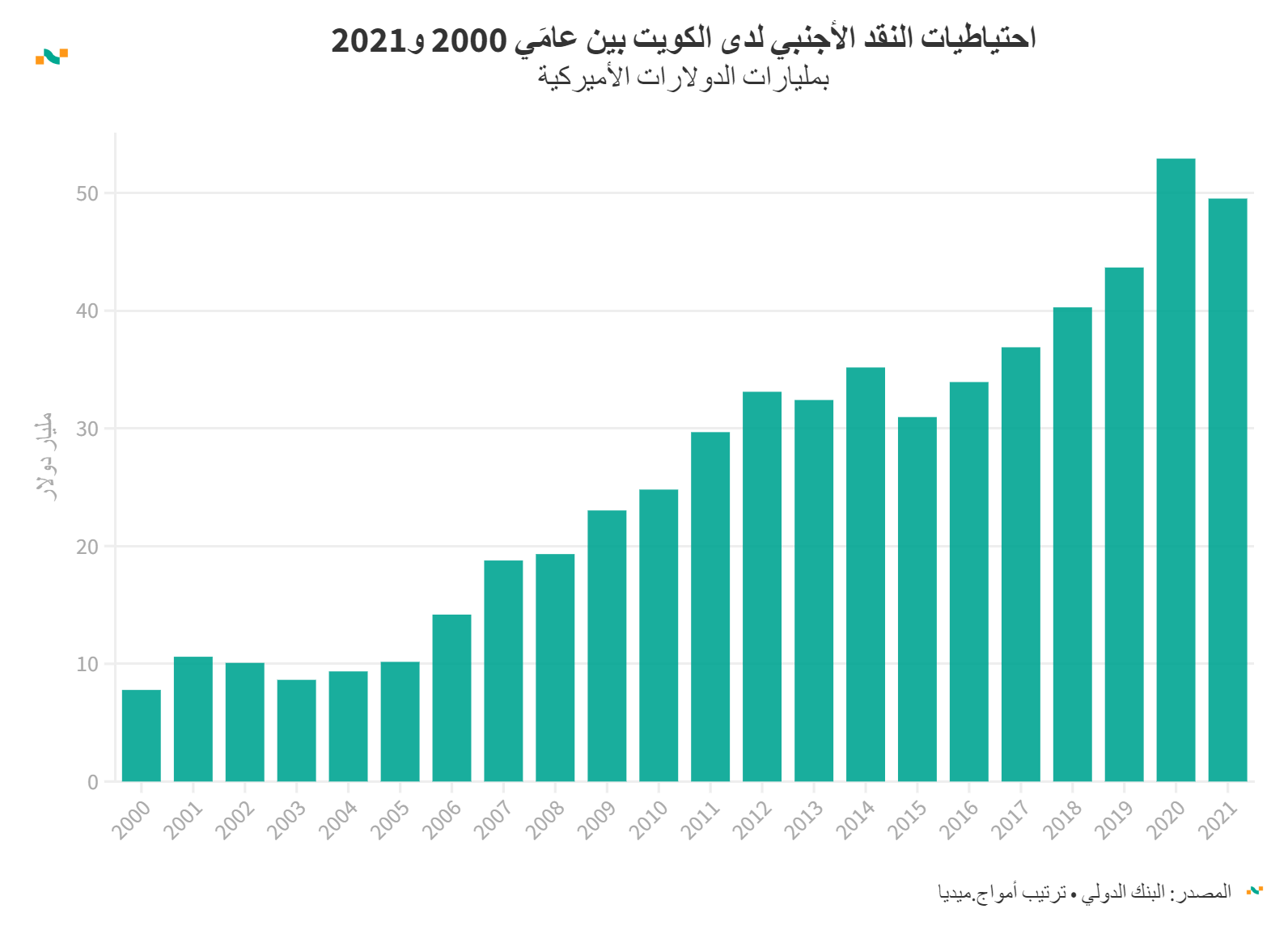 احتياطيات النقد الأجنبي لدى الكويت بين عامَي 2000 و2021