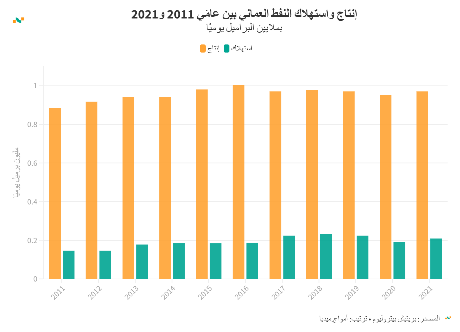 إنتاج واستهلاك النفط العماني بين عامَي 2011 و2021