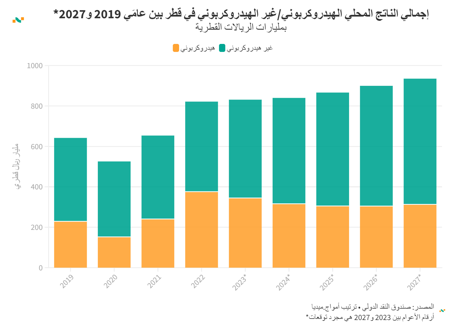 إجمالي الناتج المحلي الهيدروكربوني/غير الهيدروكربوني في قطر بين عامَي 2019 و2027*