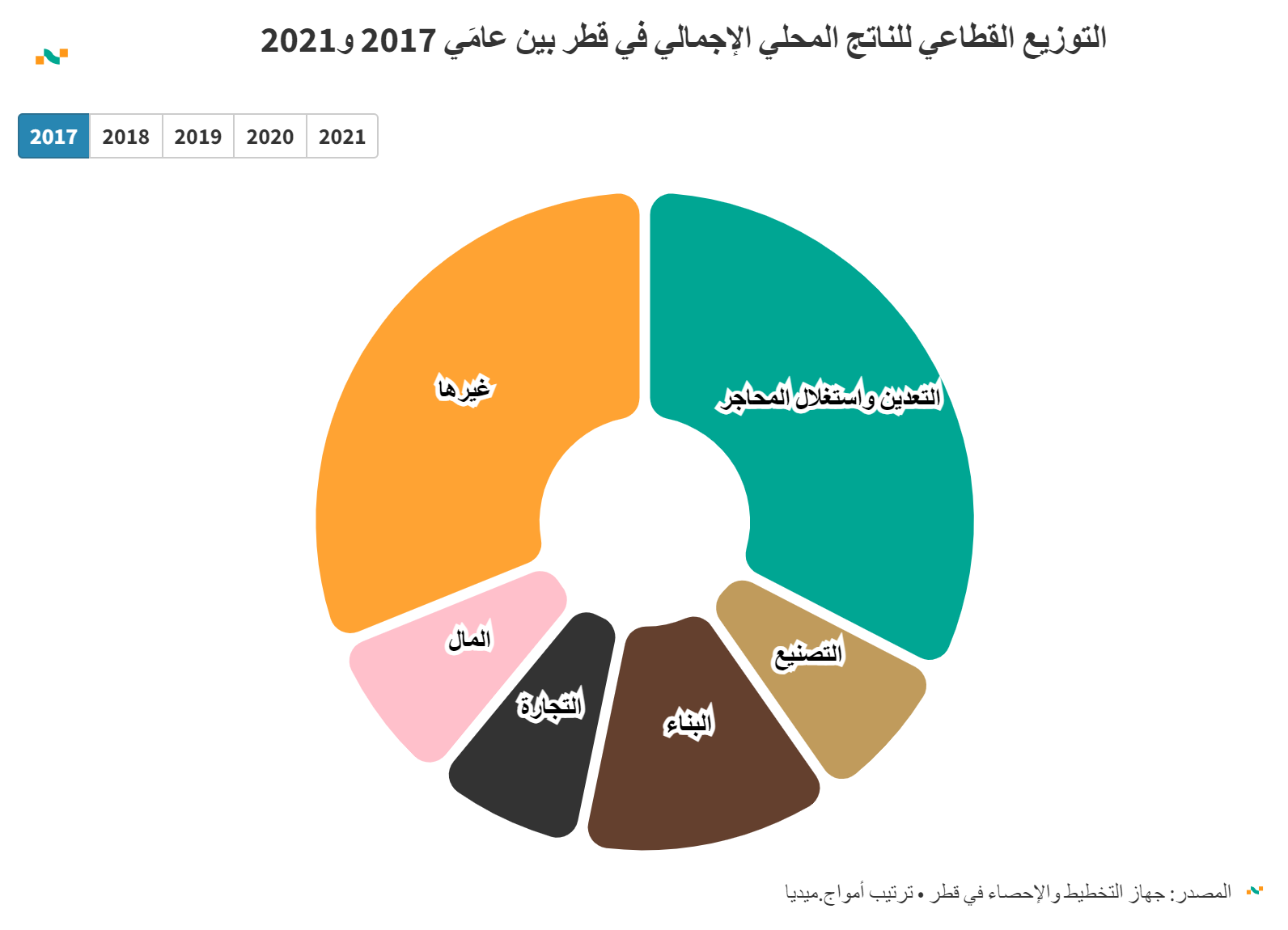 التوزيع القطاعي للناتج المحلي الإجمالي في قطر بين عامَي 2017 و2021