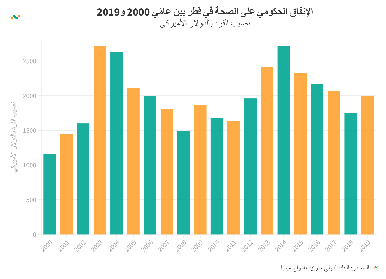 الإنفاق الحكومي على الصحة في قطر بين عامَي 2000 و2019