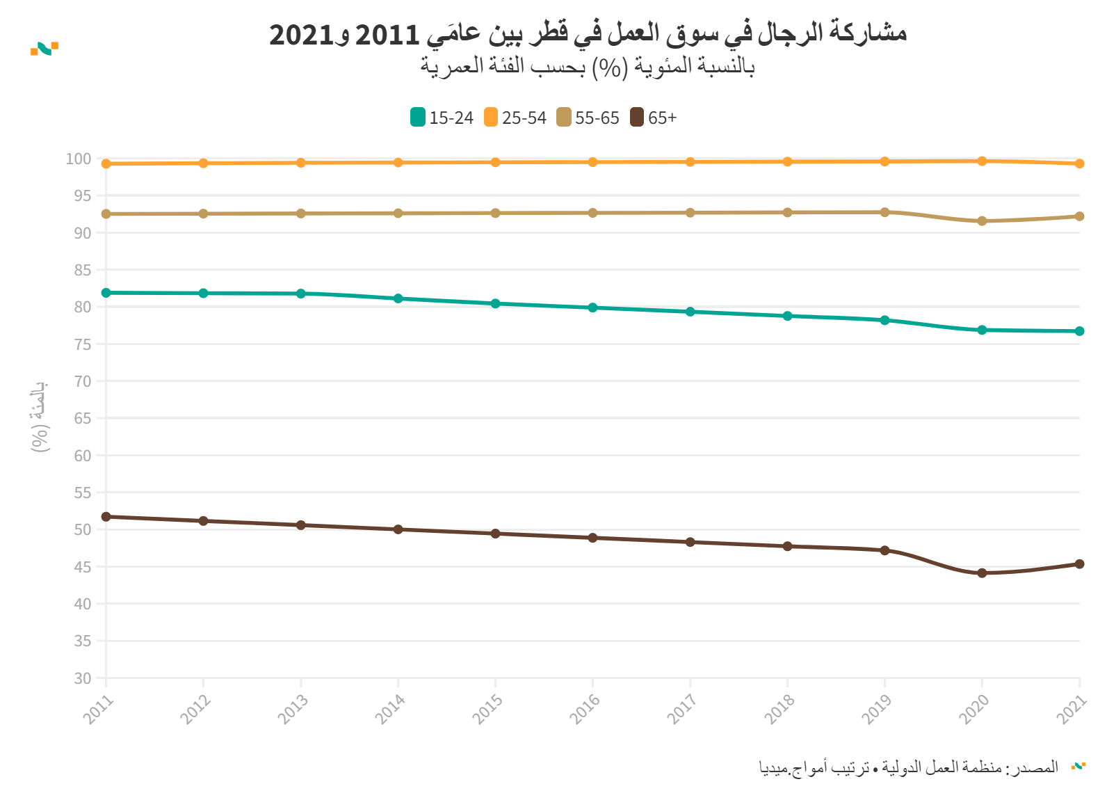مشاركة الرجال في سوق العمل في قطر بين عامَي 2011 و2021