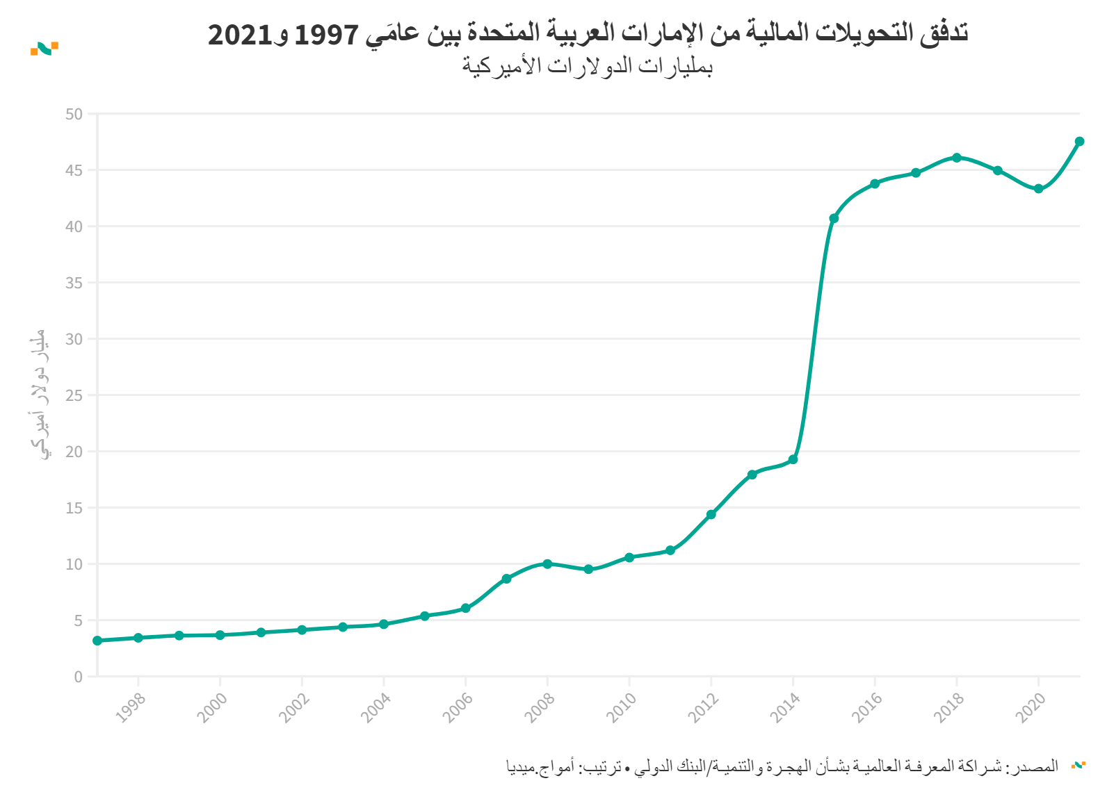 تدفق التحويلات المالية من الإمارات العربية المتحدة بين عامَي 1997 و2021