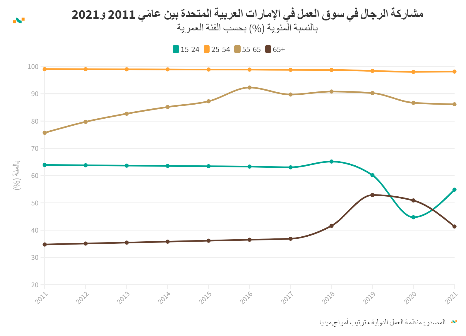 مشاركة الرجال في سوق العمل في الإمارات العربية المتحدة بين عامَي 2011 و2021