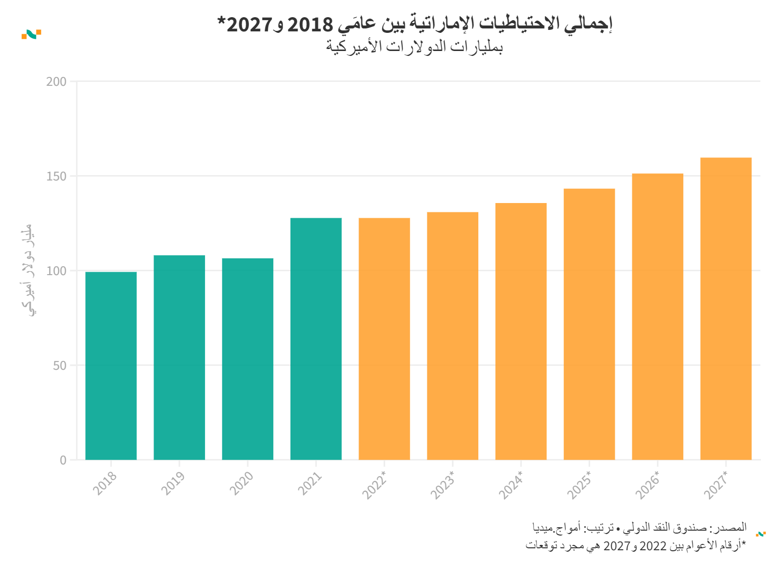 إجمالي الاحتياطيات الإماراتية بين عامَي 2018 و2027*