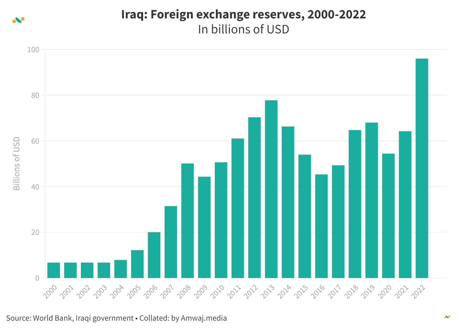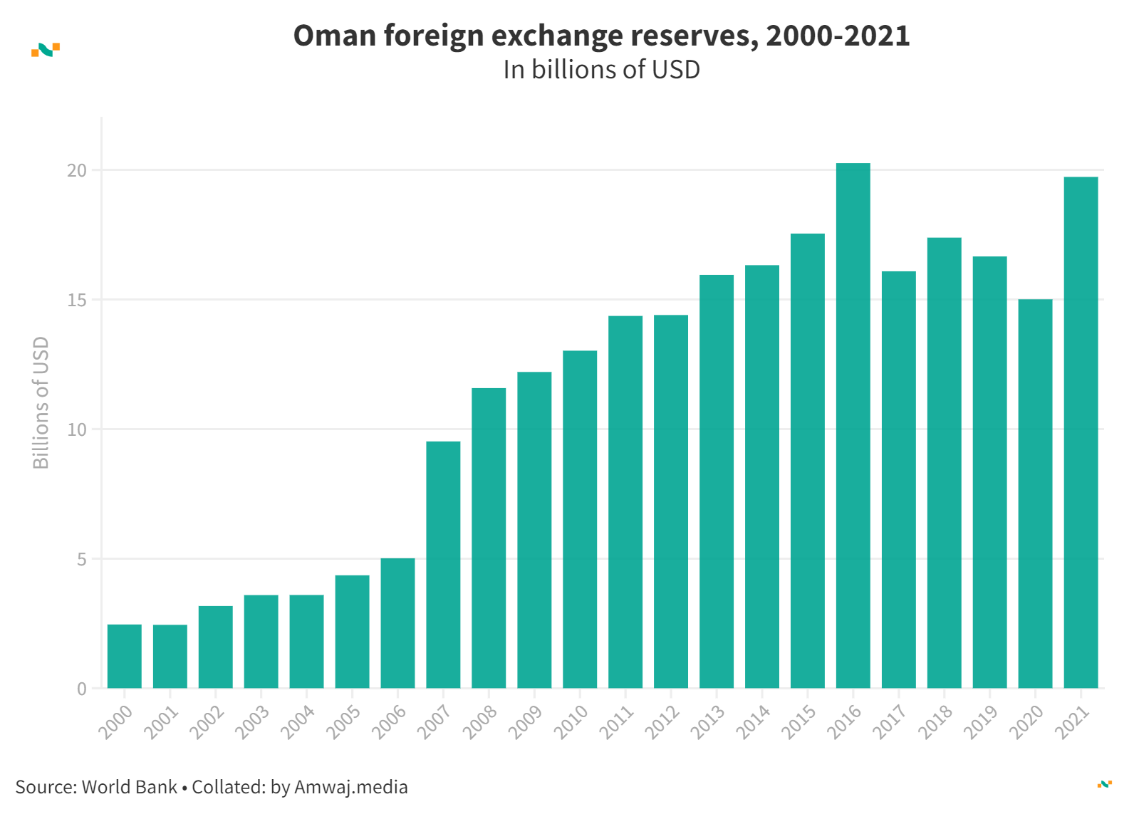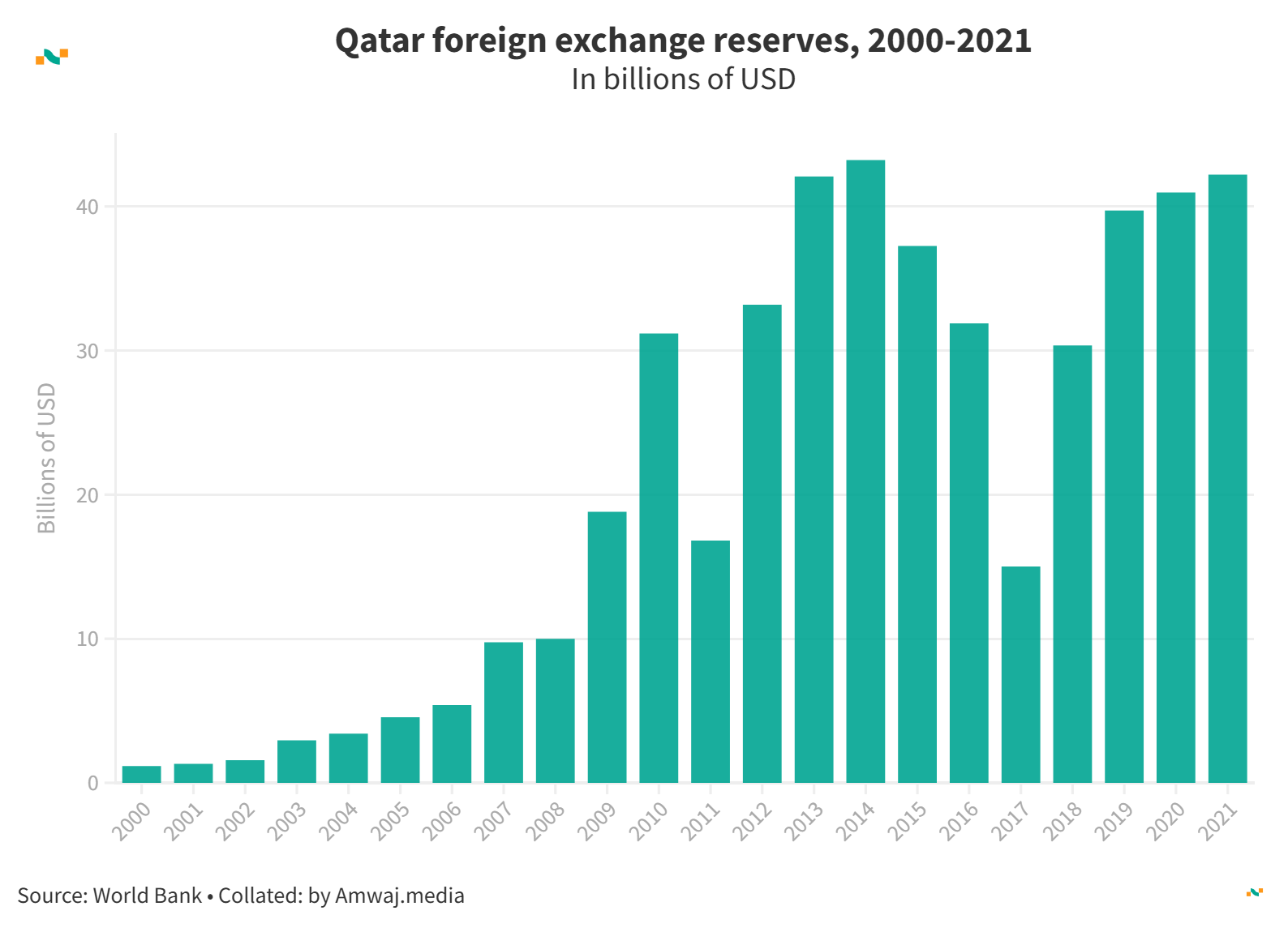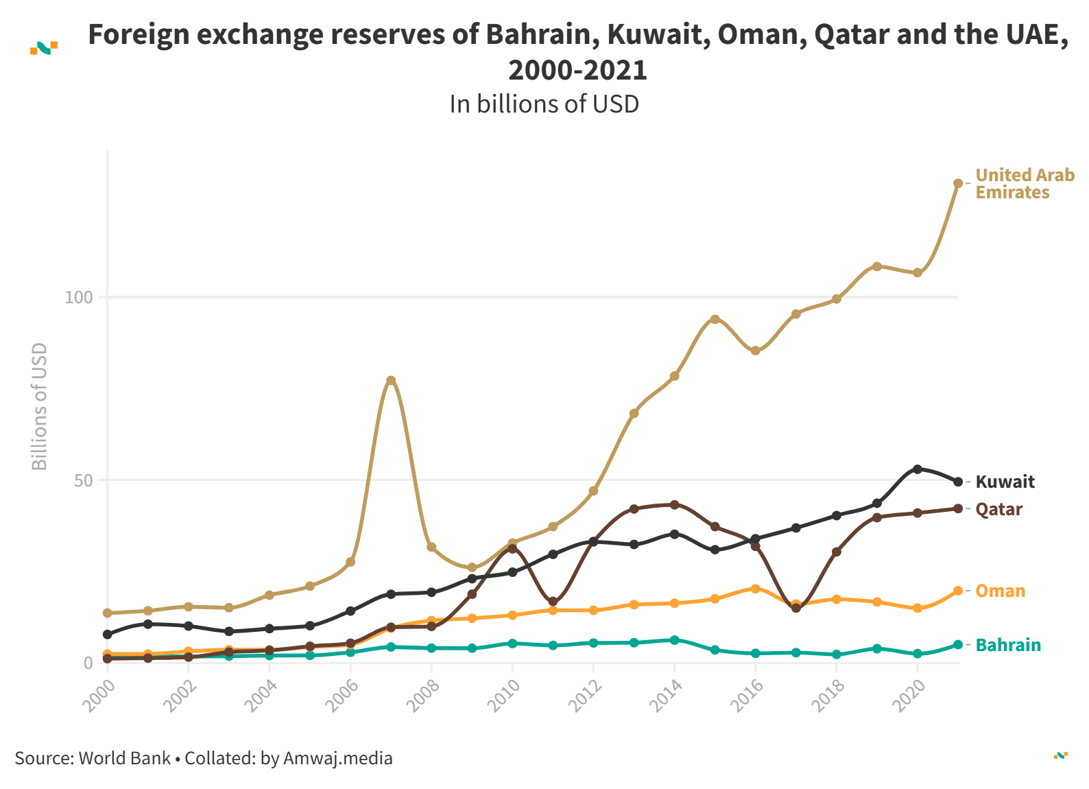 Foreign exchange reserves of Bahrain, Kuwait, Oman, Qatar and the UAE, 2000-2021