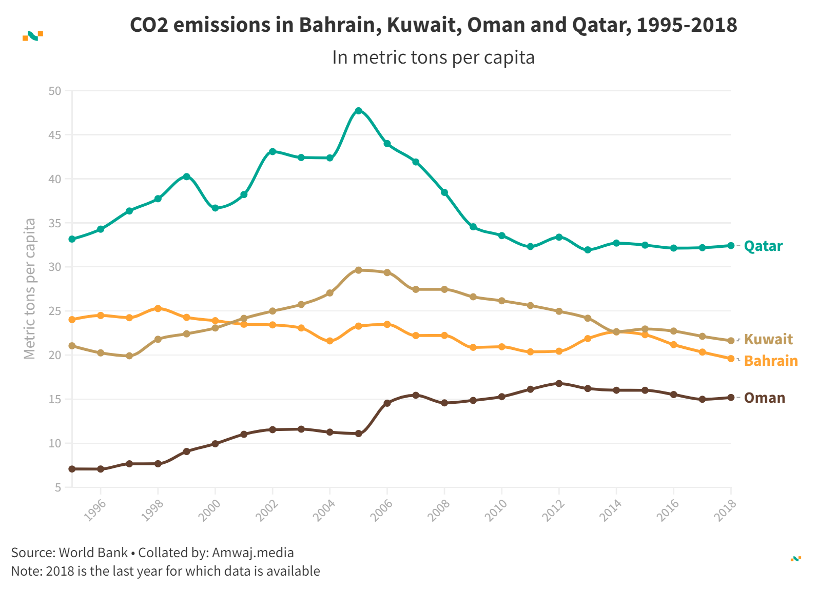 CO2 emissions in Bahrain, Kuwait, Oman and Qatar, 1995-2018