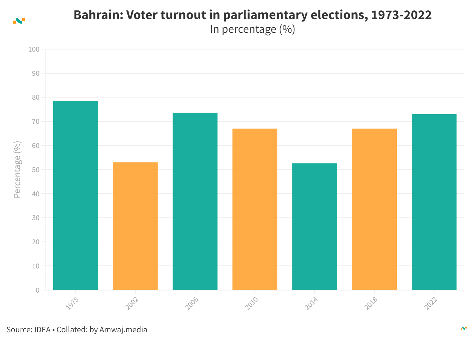 Bahrain: Voter turnout in parliamentary elections, 1973-2022
