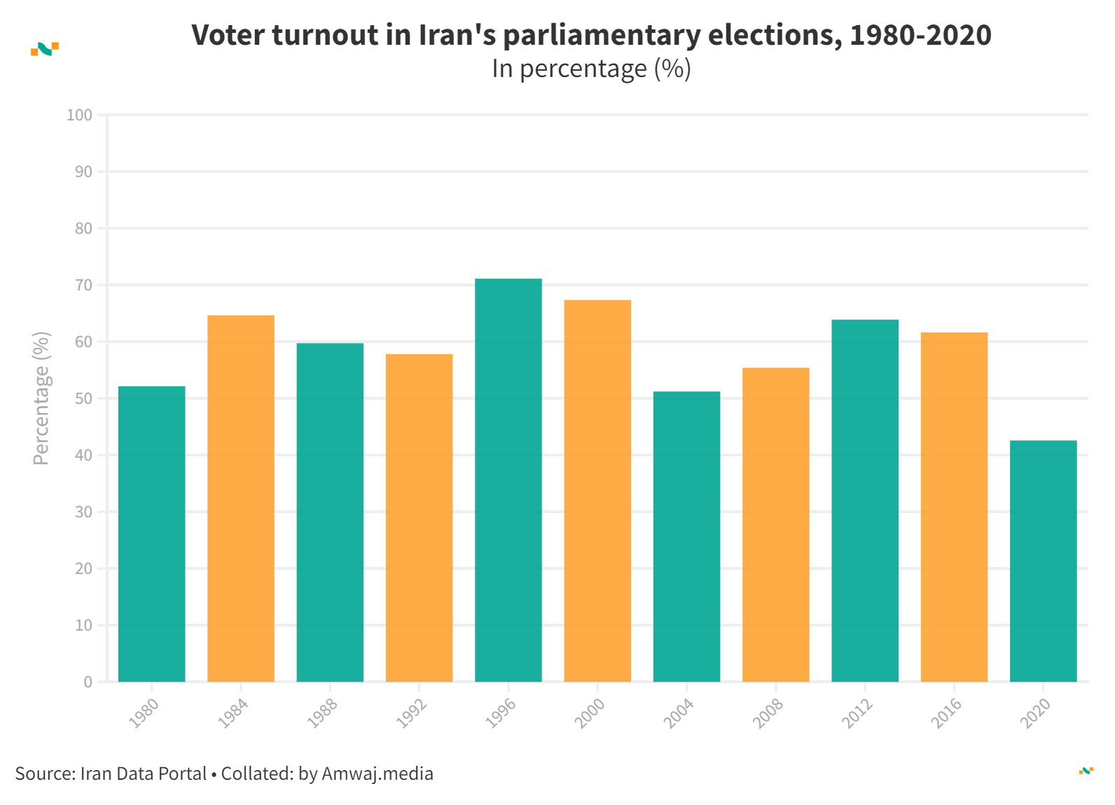 Voter turnout in Iran's parliamentary elections, 1980-2020