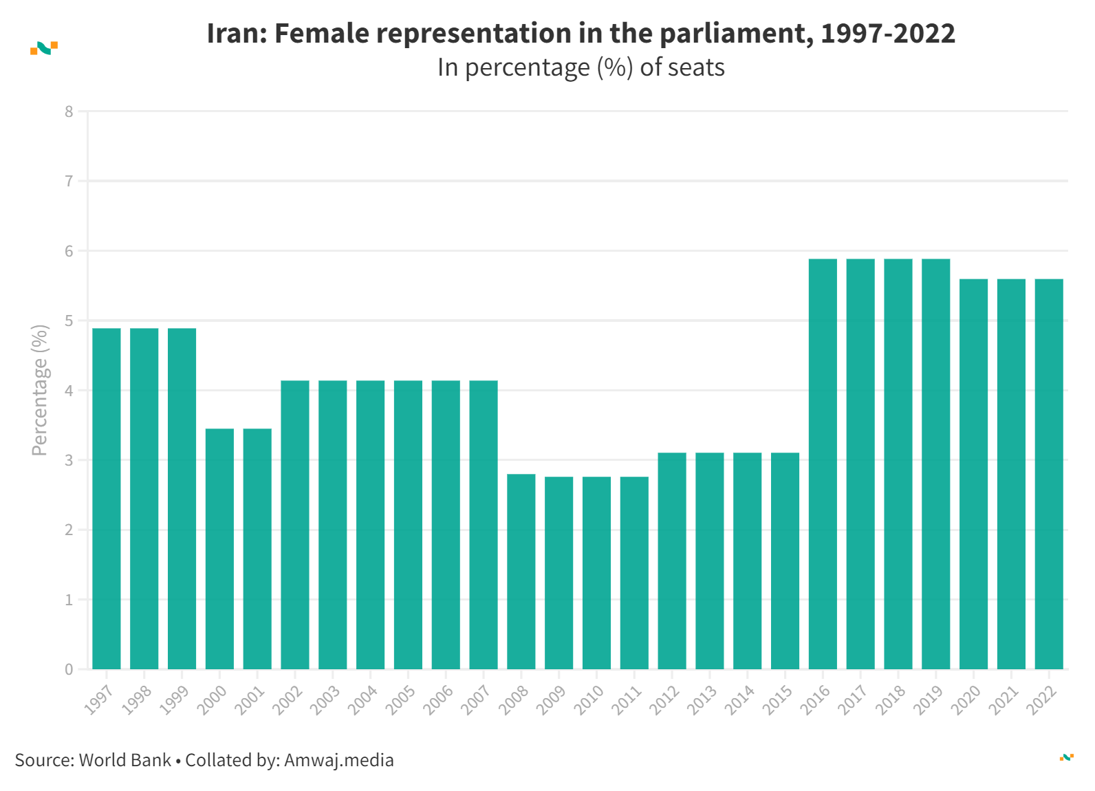 Iran: Female representation in the parliament, 1997-2022