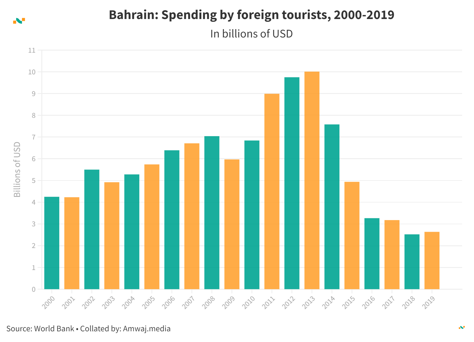 Bahrain: Spending by foreign tourists, 2000-2019