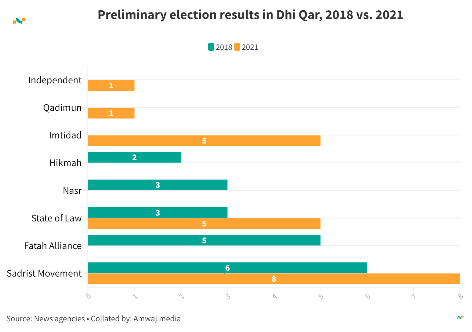 Preliminary election results in Dhi Qar, 2018 vs. 2021