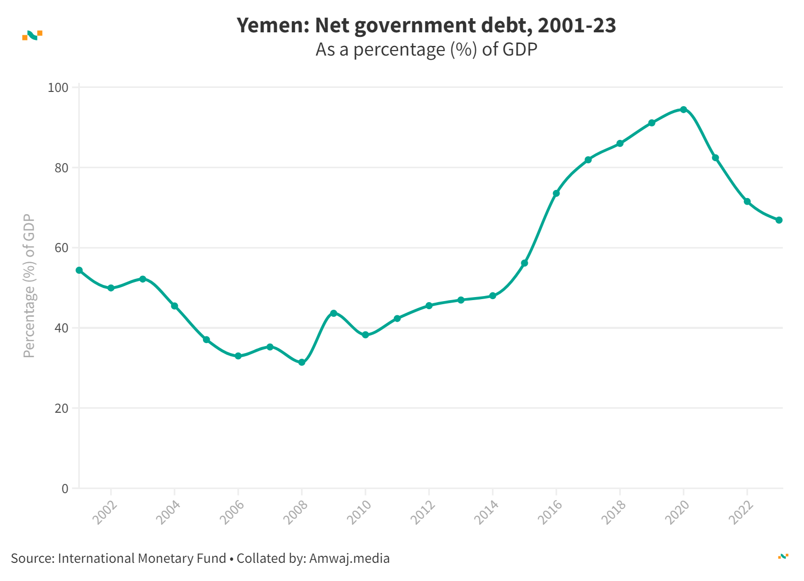 Yemen: Net government debt, 2001-23