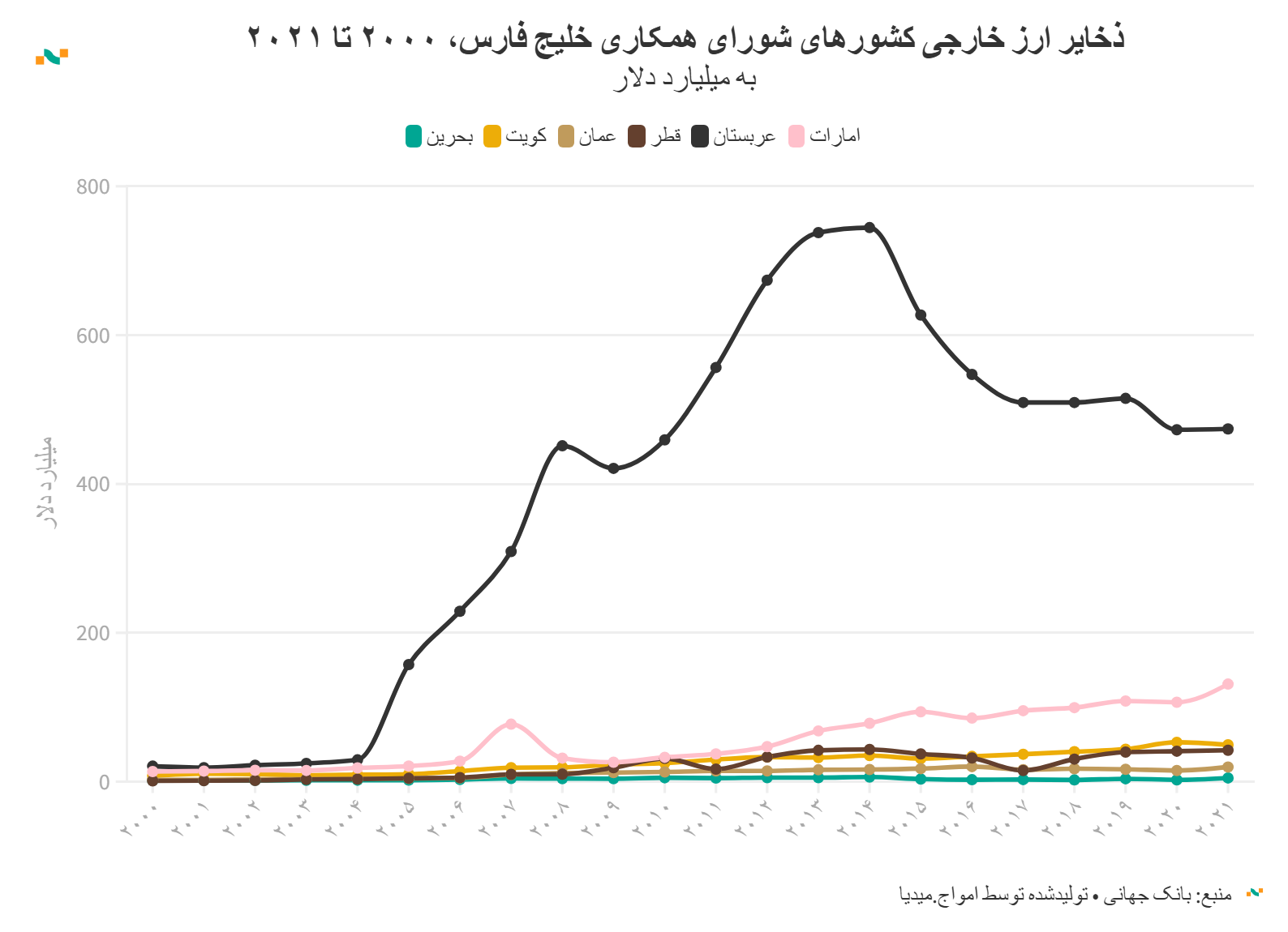 ذخایر ارزی بحرین، کویت، عمان، قطر و امارات، ۲۰۰۰ تا ۲۰۲۱