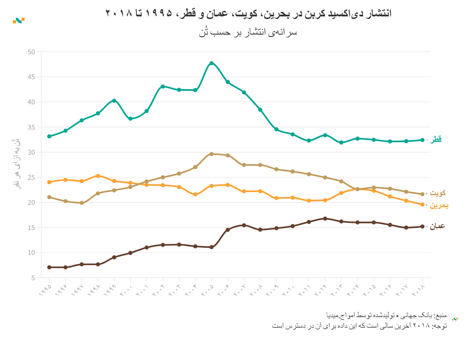 انتشار دی‌اکسید کربن در بحرین، کویت، عمان و قطر، ۱۹۹۵ تا ۲۰۱۸