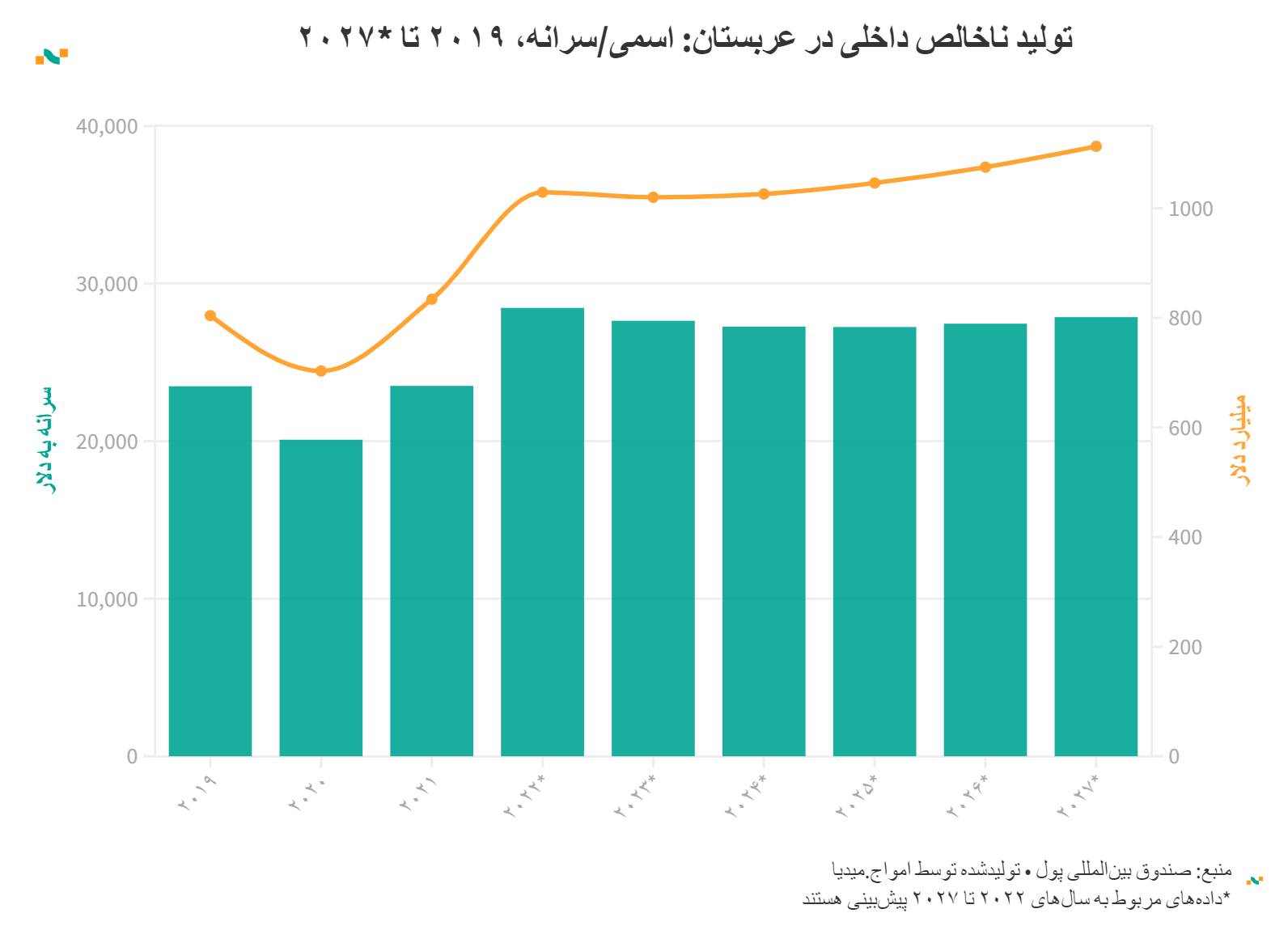 تولید ناخالص داخلی در عربستان: اسمی/سرانه، ۲۰۱۹ تا ۲۰۲۷*