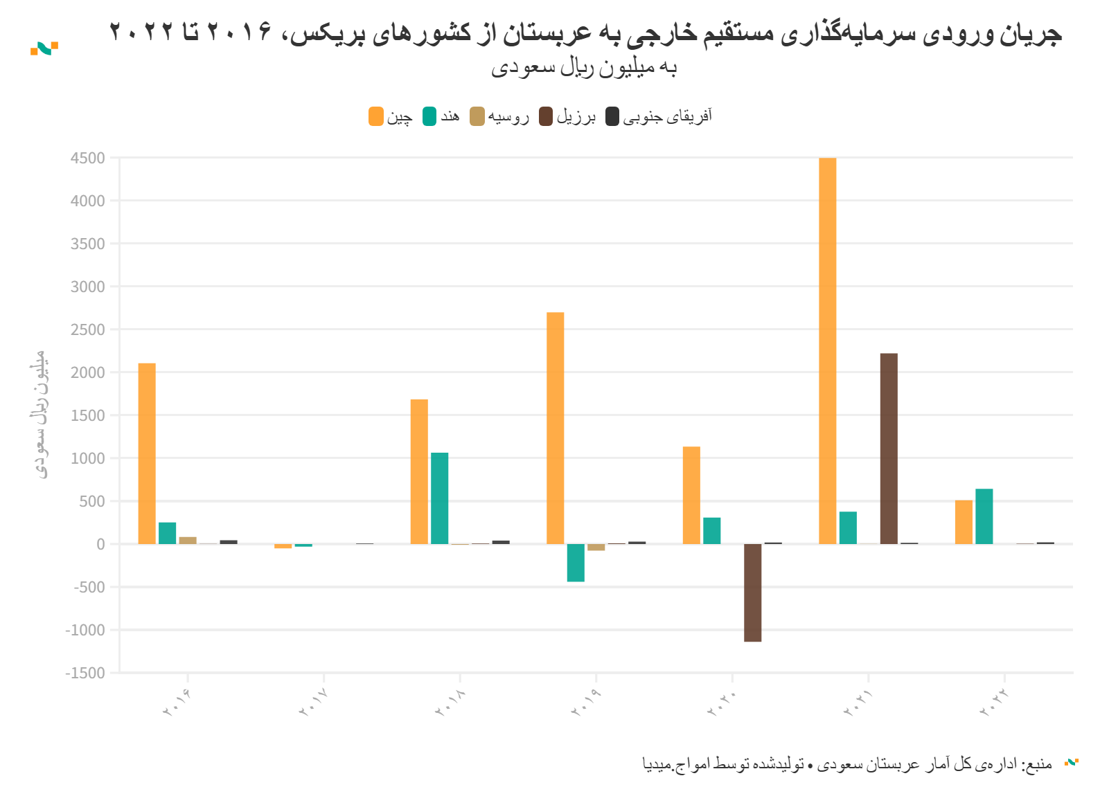 جریان ورودی سرمایه‌گذاری مستقیم خارجی به عربستان از کشورهای بریکس، ۲۰۱۶ تا ۲۰۲۲